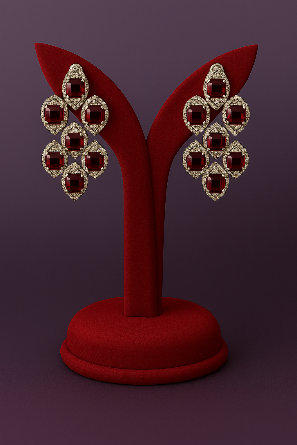 Turn every head in the room with our Crimson Royal Drops – a regal pair of chandelier earrings adorned with deep ruby-red stones, outlined in dazzling CZ diamonds. These high-quality statement earrings add the perfect amount of drama and elegance to ethnic and Indo-western outfits.