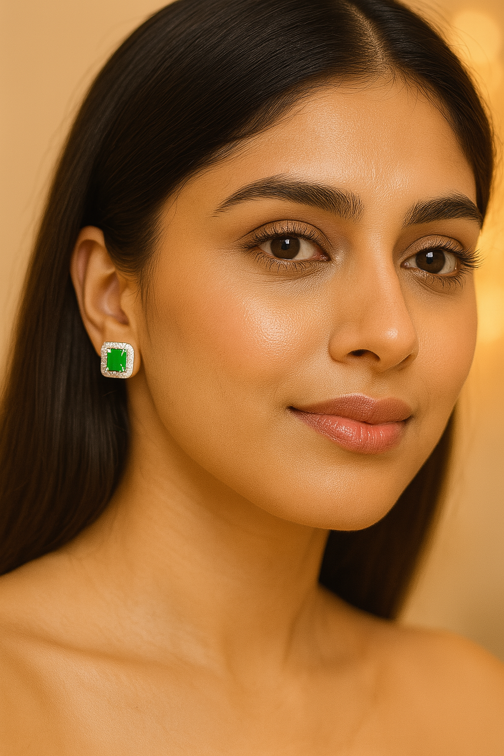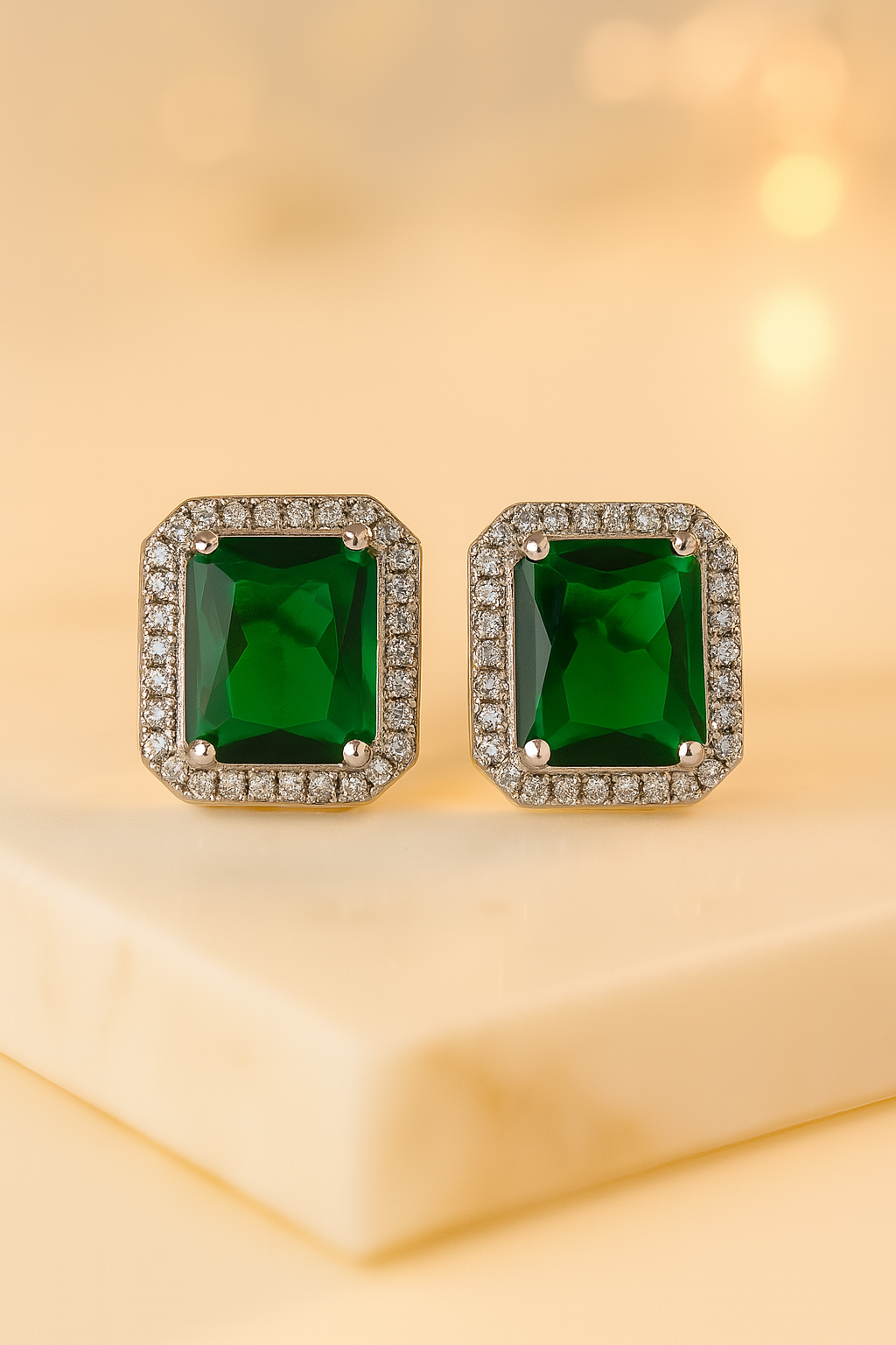 Unveil pure sophistication with the EmeraGlint Silver Halo Studs, crafted from premium 925 sterling silver and plated in rhodium for lasting luster and tarnish resistance. Each stud features a brilliant emerald-green cubic zirconia in an elegant emerald cut, surrounded by two rows of water- and sweat-proof, conflict-free lab-grown diamonds for a total sparkle . Hypoallergenic and lightweight, these timeless studs secure comfortably with friction (butterfly) backs—perfect for everyday elegance or special evenings out.
