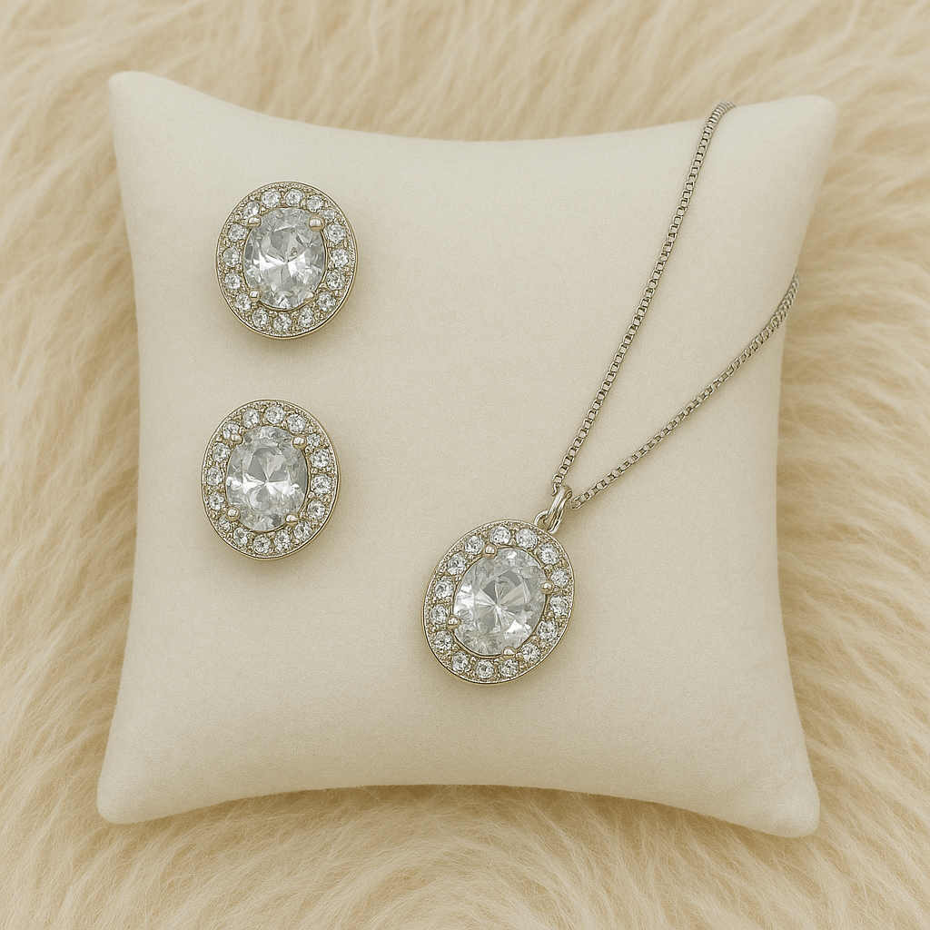 Shop MoonMist – a Korean Pendant Set featuring silver oval CZ pendant and earrings with a crystal halo. Waterproof, stylish & ideal for gifting or daily wear.