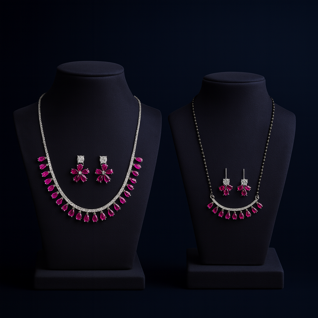 Shop RubyFlare Duo: high-clarity diamond necklace + ruby mangalsutra combo. Hypoallergenic, water- & sweat-proof, anti-tarnish shine.