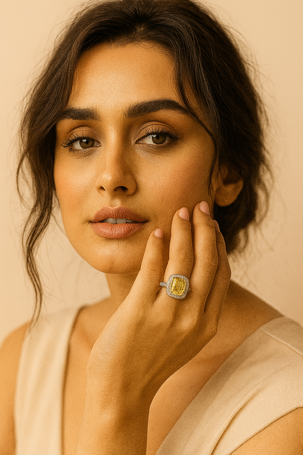 Add a radiant glow to your collection with the Sunara Glow Ring. Made with pure 925 sterling silver, this elegant ring features a stunning cushion-cut yellow CZ diamond framed by a delicate halo of micro CZ stones. Its minimal yet regal design makes it perfect for both daily wear and grand occasions.