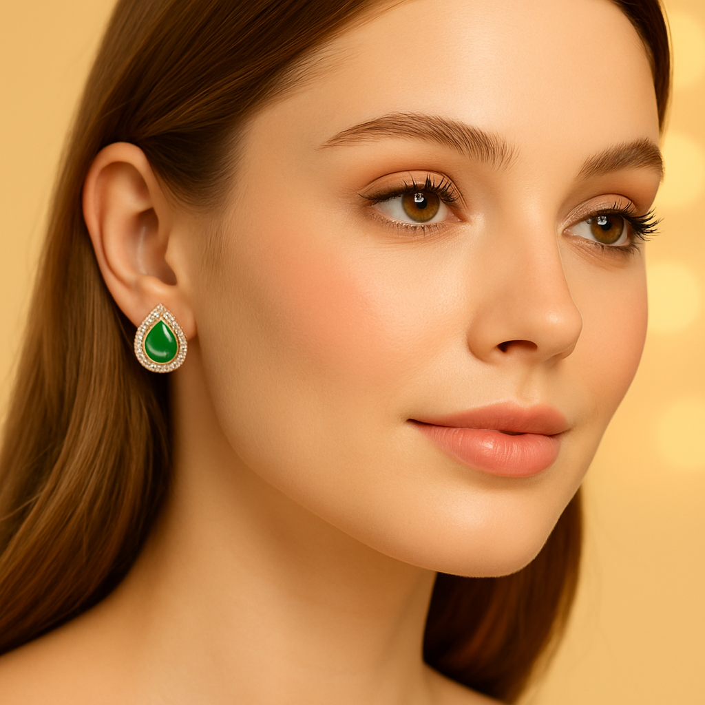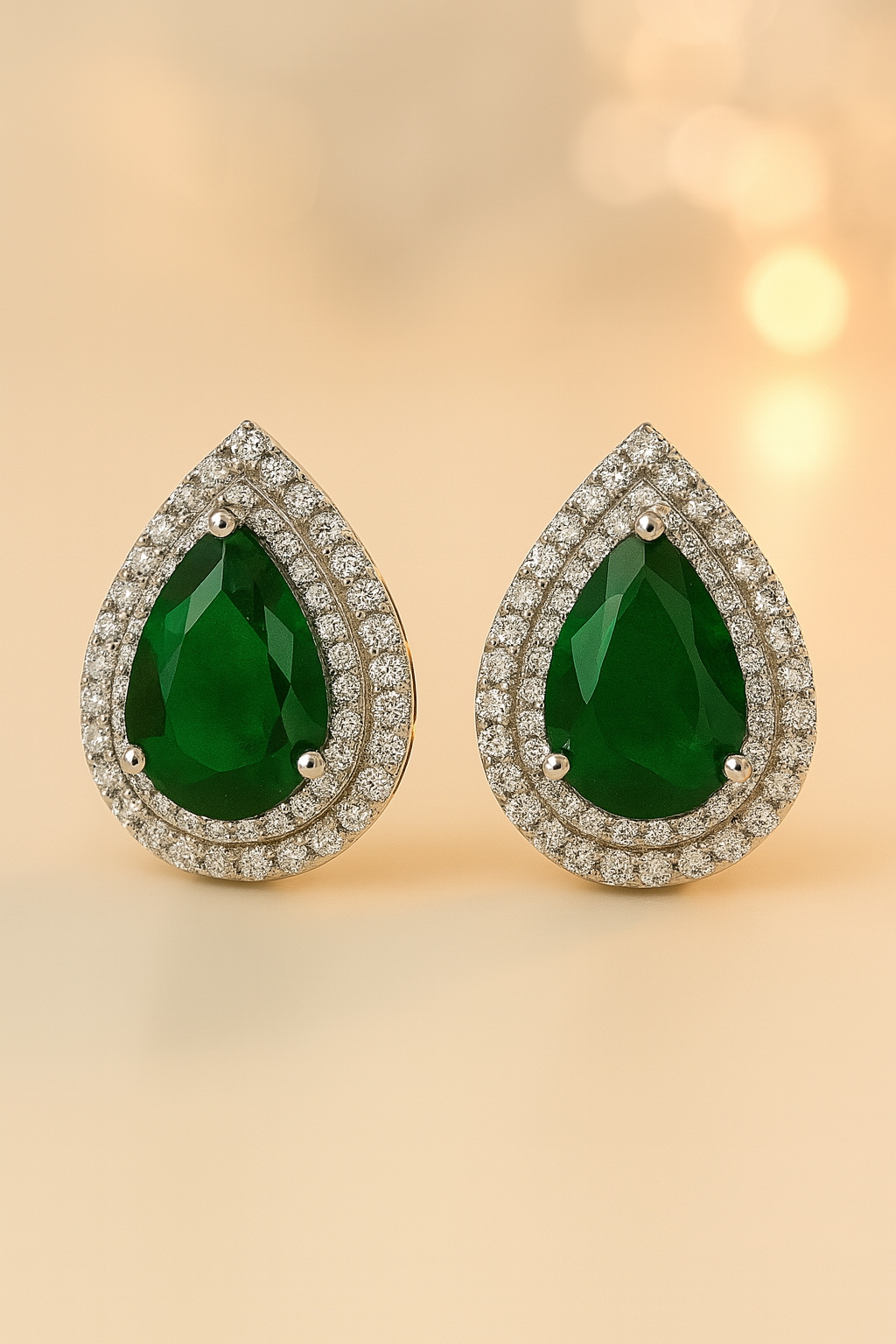 Illuminate your look with the VerdeHalo Silver Studs, expertly crafted from 925 sterling silver and finished in rhodium for lasting shine and tarnish resistance. Each stud showcases a vivid pear-cut emerald-green cubic zirconia—surrounded by a double halo of premium, water- and sweat-proof lab-grown diamonds. Hypoallergenic and lightweight, these studs sit comfortably on the earlobe with secure butterfly backs, making them the perfect choice for everyday glamour or special occasions.